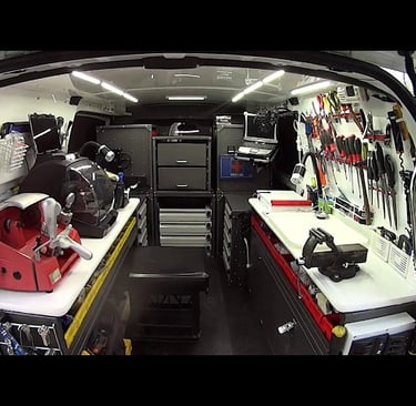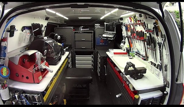 Το κατάστημα έρχεται σε εσάς! Το van μας φέρνει όλα τα εργαλεία και μηχανήματα για κλειδιά, κλειδαριές και ασφάλεια, όλο το 24/7.